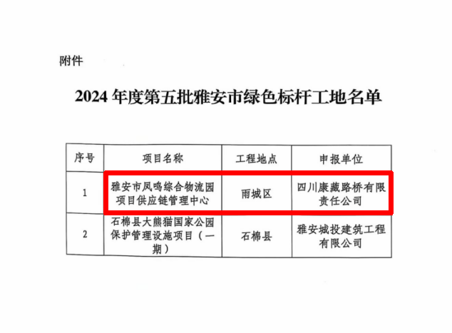 近期,由AG旗舰厅(中国)集团康藏路桥公司建设的凤鸣综合物流园项目供应链管理中心,经市住建局、市生态环境局、市城管执法局联合评审小组综合考评,被评为雅安市绿色标杆工地。