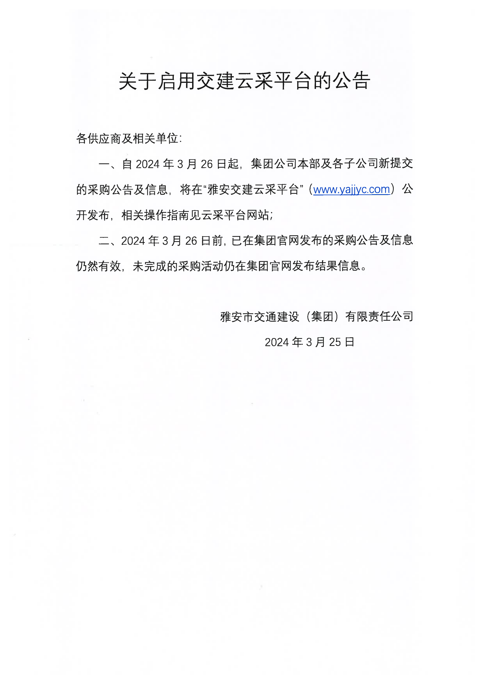 雅安市交通建设(集团)有限责任公司关于启用交建云采平台的公告