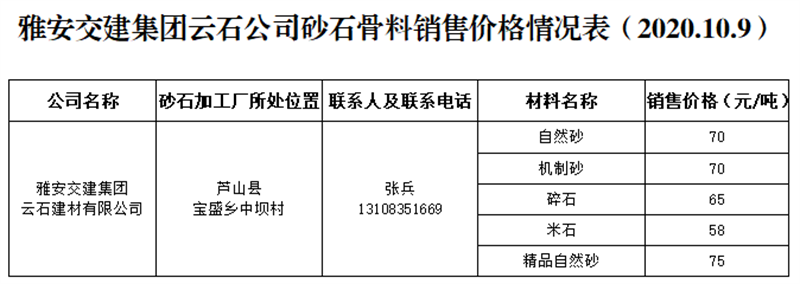 AG旗舰厅(中国)集团云石公司砂石骨料销售价格情况表(2020.10.9)