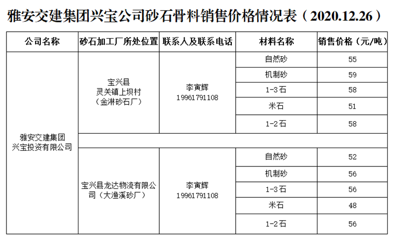 AG旗舰厅(中国)集团兴宝公司砂石骨料销售价格情况表(2020.12.26)