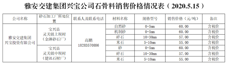 AG旗舰厅(中国)集团兴宝公司砂石骨料销售价格情况表(2020.5.15)