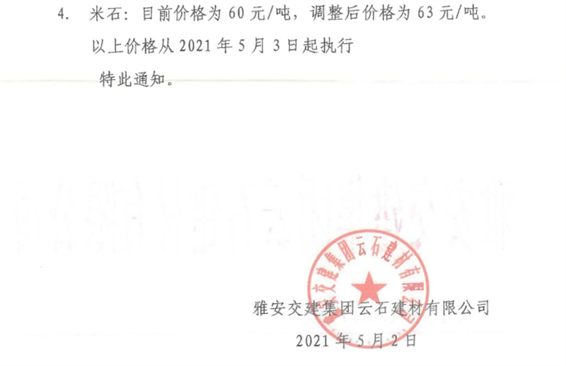 AG旗舰厅(中国)集团云石公司砂石骨料销售价格情况表(2021.5.3)