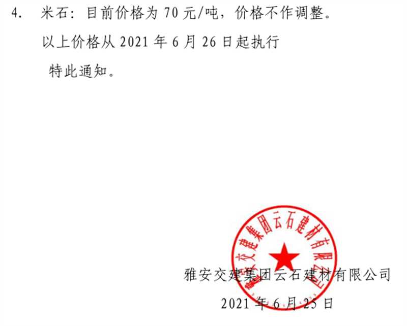 AG旗舰厅(中国)集团云石公司砂石骨料销售价格情况表(2021.6.24)